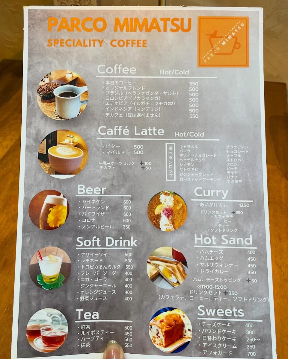 The moment you step inside, you're embraced by an aromatic symphony of spices that hints at the enticing menu awaiting you. Parco Mimatsu is renowned for its diverse offerings, notably their signature French press coffees. Here, you can indulge in a rich cup made with stellar Colombian beans sourced from the Bucaramanga region, characterized by its silky texture and gentle milky sweetness — an absolute steal at JP¥500.